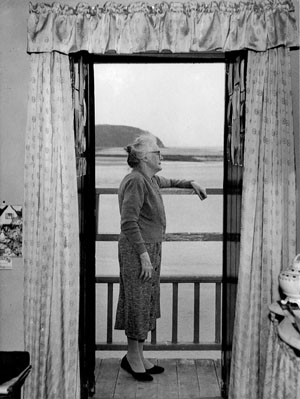 Florrie Thomas, Dylan's mother, standing outside the door to the sea, which is only accessible via a balcony.