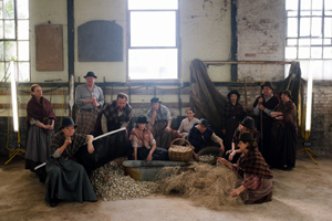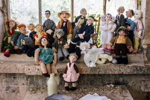 Many locals were involved creating or appearing in the 2014 NTW production, including Annie Hardy who knitted the Under Milk Wood characters that were sprinkled in windows around Laugharne. Here the dolls are photographed in the bus garage.