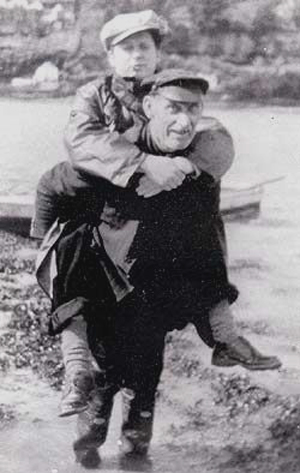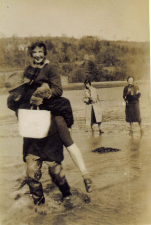 The Roberts family lived here for decades. There were three brothers: Jack the eldest who rowed the boat and stayed at home; Na, a gardener and labourer who tended fishing nets; and Dai, a friendly chap, who went round Laugharne and St. Clears with homemade wicker panniers of fish. The pic is of Jack carrying a youthful Dylan Thomas, with the Boathouse in the background, and the pic below is from 1935.