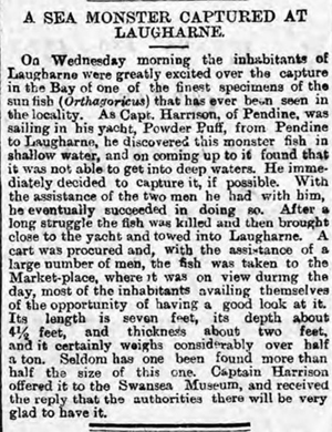 'A Sea Monster Captured in Laugharne' rang out as a headline in July 1892 - 'The fish as taken to the Market-place... most of the inhabitants availing themselves of the opportunity of having a good look at it. It's length was seven feet... and it certainly weighs considerably over half a ton.' The Sea Monster was a Sun Fish (below). One can understand why the people of Laugharne were 'greatly excited'.
