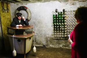 In the cellar is a wine-rack for 365 bottles (geddit?!), and a bar in the shape of a boat. In the 2014 NTW play Raw Material: Llareggub Revisited, local man John Bradshaw played the role of Captain Cat (above). Bottles in the wine racks had numbers, and the audience was asked to call out a number. John would then regale that particular tale. He learned 4 but the perception was he had a story for every day of the year. The play was a series of art exhibits where people could wander around Laugharne with a map. In the Pelican a coffin jutted out of the window. Inside were crumpled up pages of the Under Milk Wood script with a small boat riding the paper waves and a video of Michael Sheen reading 'Do Not Go Gentle' on the TV.