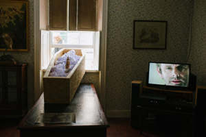 to fit down the hallway. A friend remarked on seeing Dylan's body in the open coffin in D.J.'s study, 'He'd never have been seen dead in that tie.'