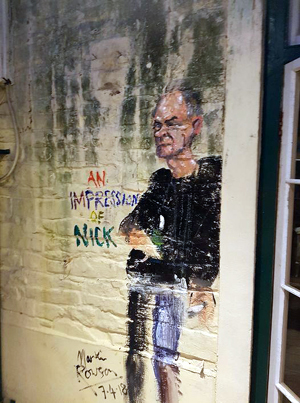 Martin Rowson, the Guardian cartoonist, stayed there regularly during the Laugharne Weekends and painted a picture of his good friend Nick in the porch (below).