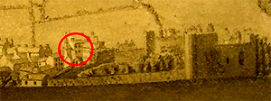But before those three houses were built a large house stood here - The Great House (but not Great House!). Above is a view of Laugharne in 1834, and below is a close-up of the house. It's in the centre of the circle, with the Town Hall to the left, and Castle House to the right. Also visible is Raven House, The Globe and the Tabernacle.